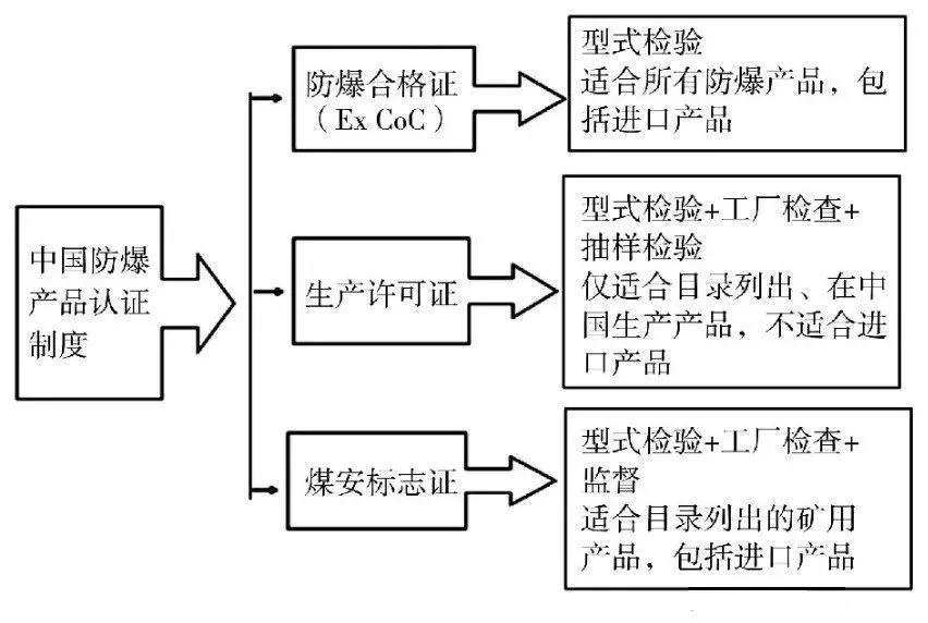 中国防爆产品认证制度实行防爆合格证和生产许可证,防爆合格证为型式检验,适合于所有防爆产品,通过型式检验后颁发防爆合格证。生产许可证针对实施细则目录中列出的在中国境内生产的产品,产品需通过型式检验,工厂通过生产条件审查后,由国家质检部门颁发生产许可证,后续还要进行周期性的监督抽查。对于矿用产品还需满足煤安标志认证,需进行型式检验、工厂检查和监督,如图3所示。